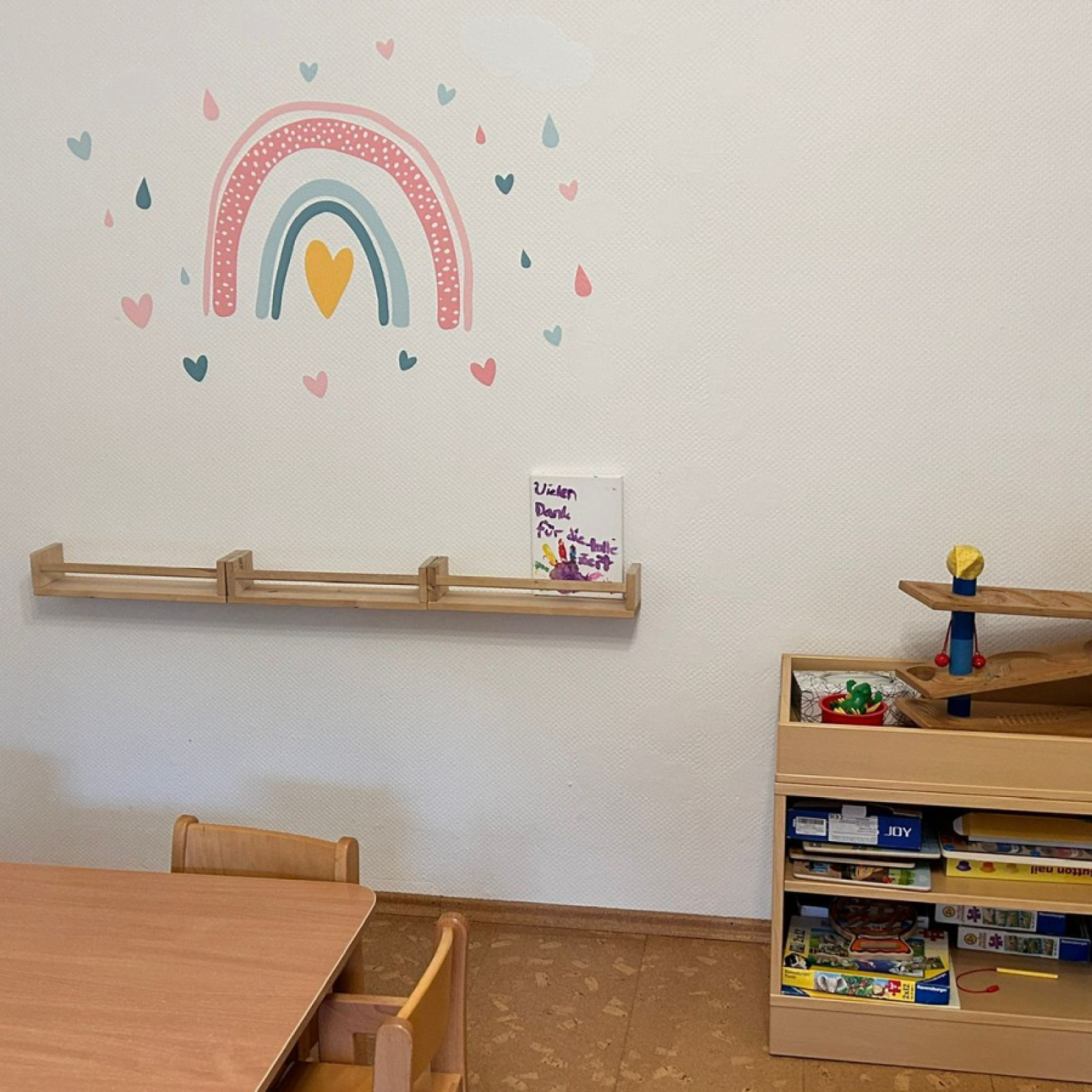 Für den Mittagsschlaf gibt es den Schlafraum mit eigenem Bett für jedes Kind. . In den Räumen gibt es verschiedene Bereiche zum Basteln oder Spielen – manche Bereiche werden auch für verschiedene Anlässe umgeräumt.